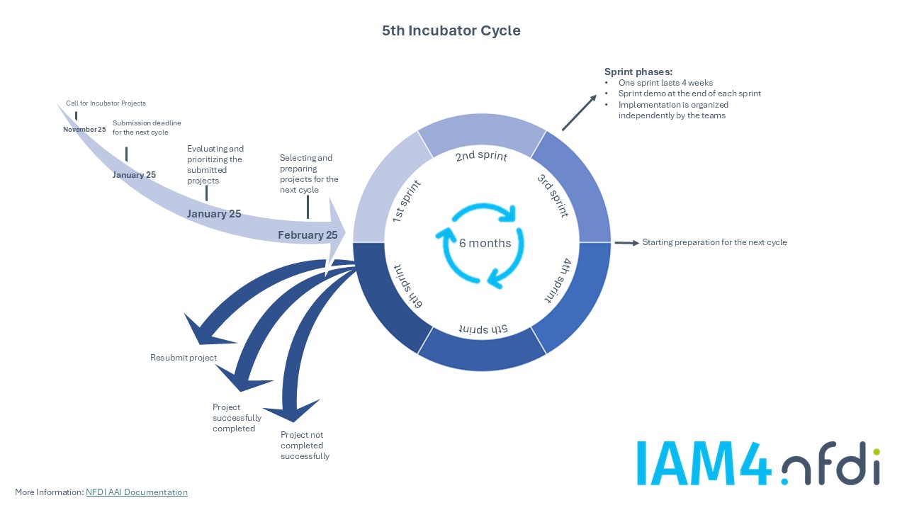 Do you have an AAI-specific use case that you need support to implement? Then this is your chance: As part of the IAM4NFDI project, we have planned so-called incubator cycles to be able to react flexibly to the wishes of future users. With the incubator cycles you can bring in your ideas and needs for the NFDI-AAI and, thus, help shape its development.
